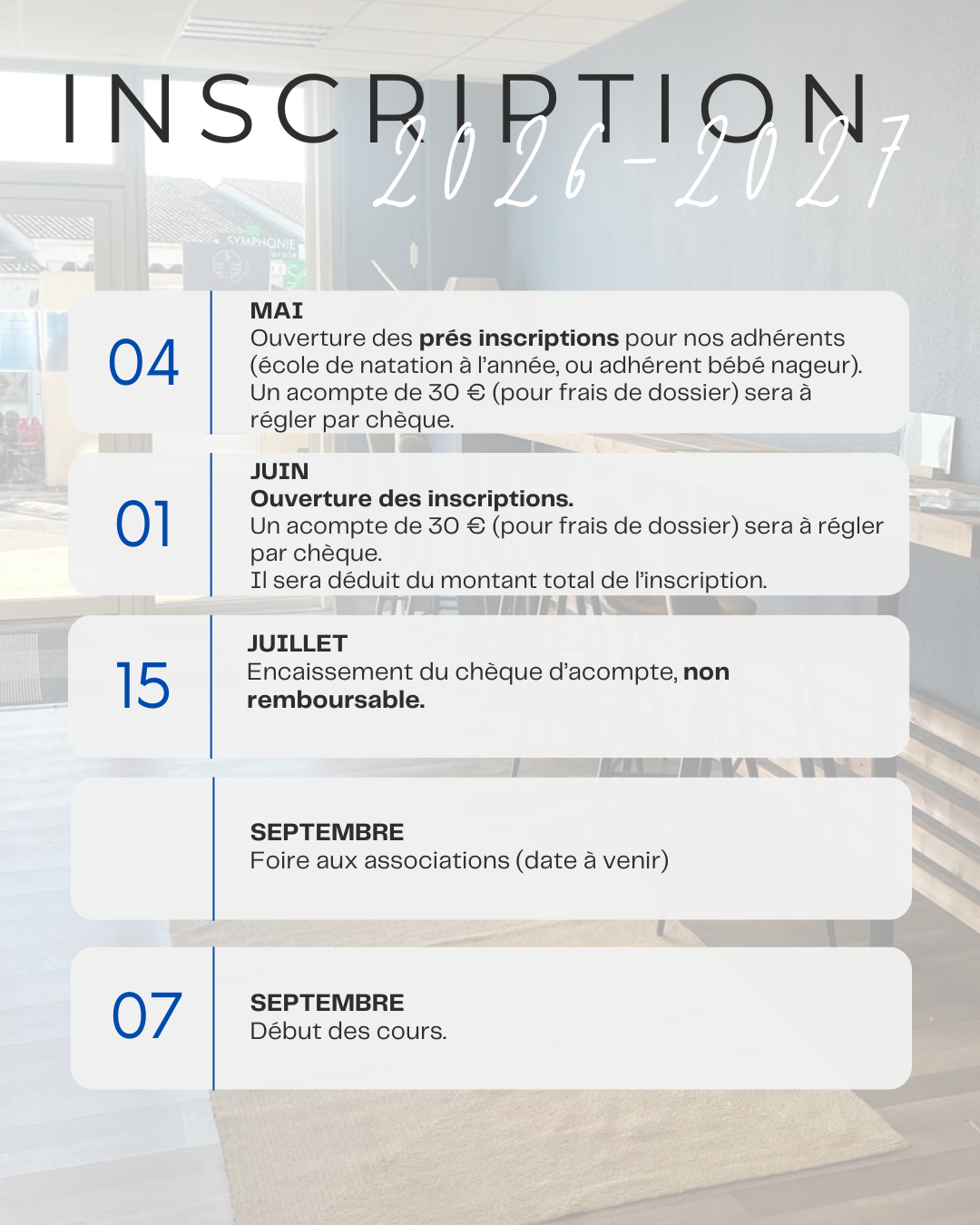 Pour les inscriptions aux écoles de natation pour la rentrée de Septembre 2026, voici les dates clés.